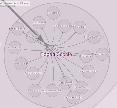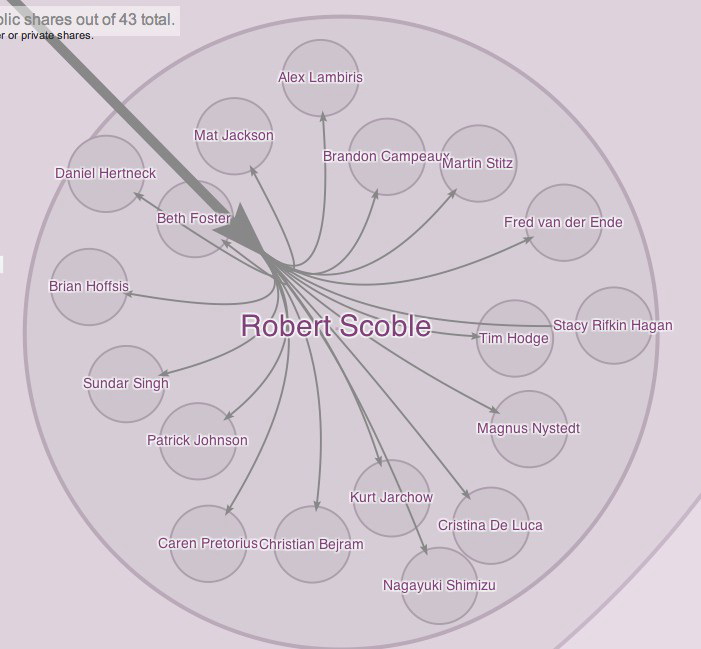 Каждый из этих людей, которые следуют за Робертом Скоблом, получили и сообщение Скобла, и при этом, как в данном случае Николас Шарбонье, другие пользователи продолжают создавать свои сообщения с оригинальным постом и ретранслировать их дальше. Это абсолютно иная вещь нежели ретвит, не правда ли?